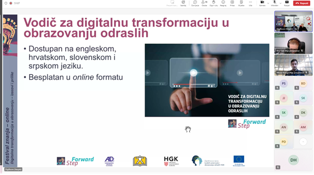 Aktivnost je obuhvatila predstavljanje vodiča za digitalnu transformaciju, podjelu iskustava predavača i sudionika s radionica posvećenih digitalnoj transformaciji, te pregled digitalnih sadržaja u obrazovanju odraslih koji su trenutno dostupni. Više od 70 sudionika pridružilo se ovom događaju putem digitalne platforme Microsoft Teams, jednog od brojnih alata koji nam omogućava međusobno povezivanje, razmjenu znanja i stvaranje inovativnih prilika u digitalnom okruženju.